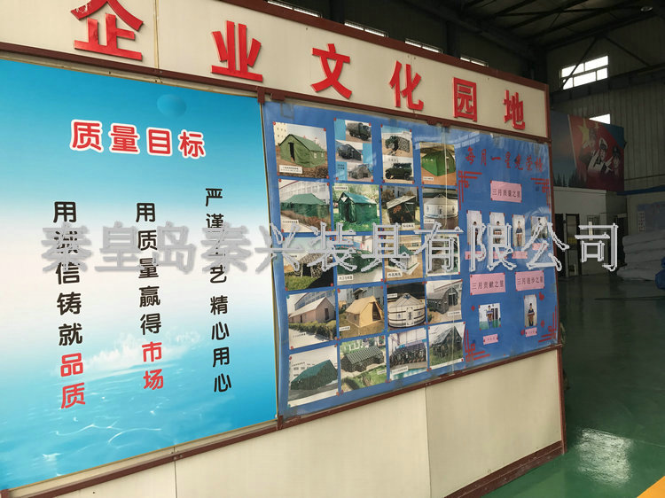 秦皇島秦興裝具有限公司有限公司源于我國第3524工廠,創(chuàng)建于2005年,占地面積30畝,是一家致力于研究,發(fā)展,制造和銷售為一體的綜合性裝具及紡織服裝加工生產(chǎn)企業(yè),我們的主要產(chǎn)品有單、棉帳篷,民用帳篷,旅游帳篷集各種機(jī)工產(chǎn)品等。